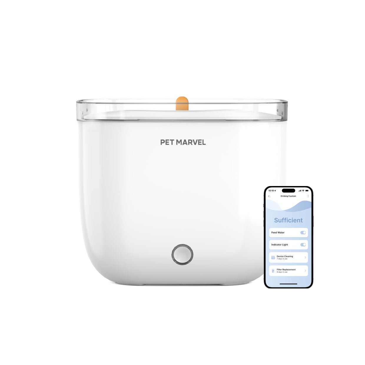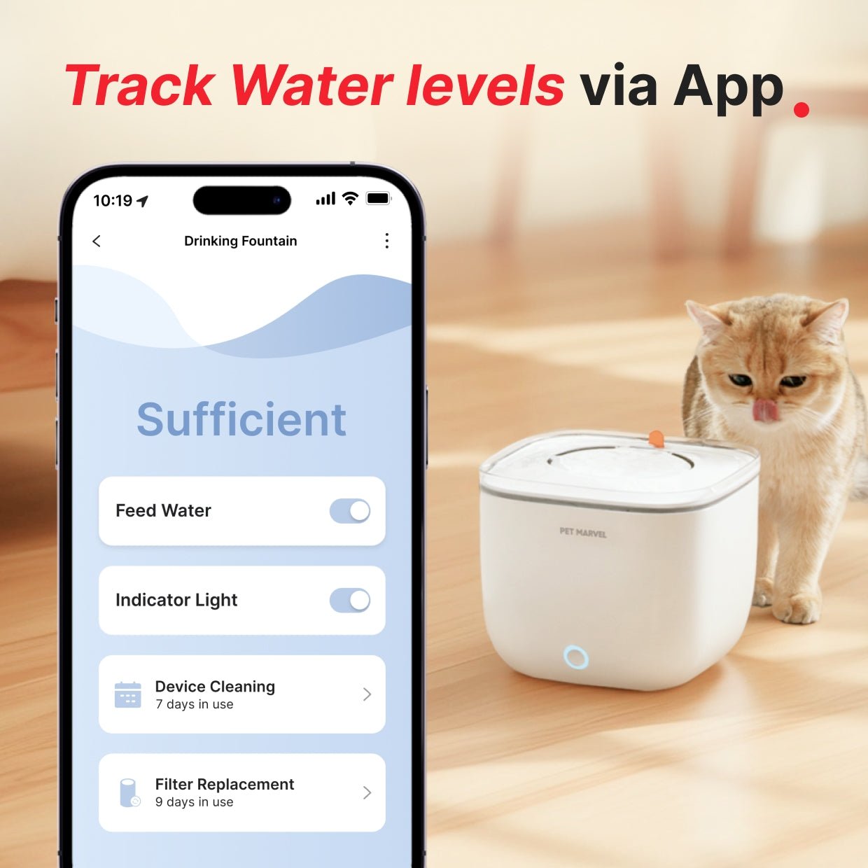 Never forget to clean the fountain or replace filters with the PET MARVEL app, designed to keep your cat's fountain running smoothly.