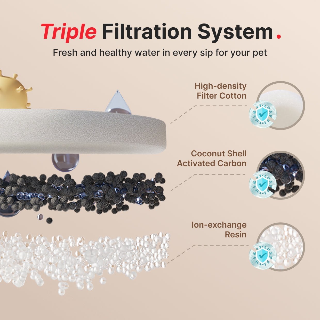 With noise levels below 25dB, the fountain operates so quietly that it won’t disturb your pet or your sleep.
